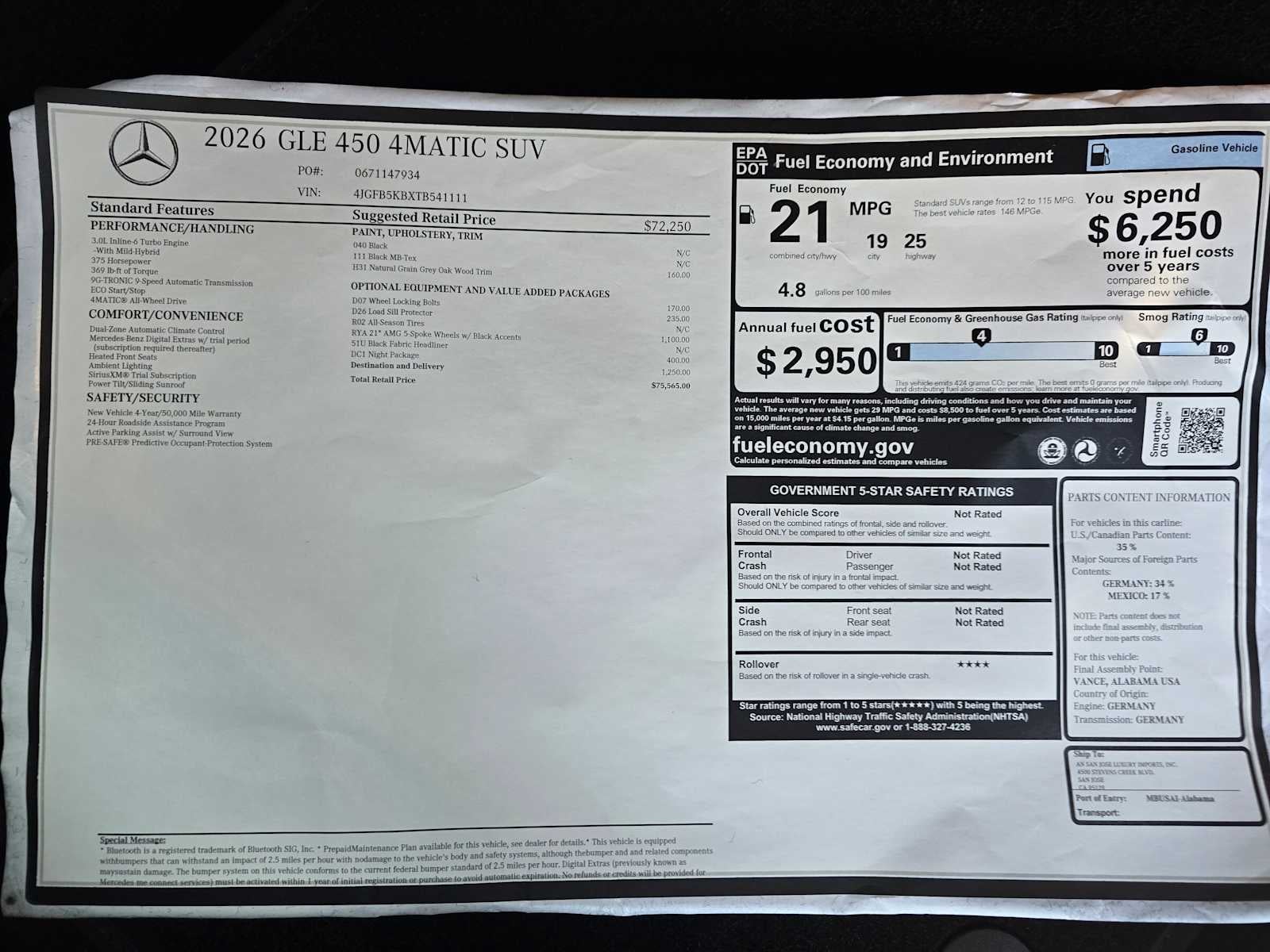 WHEELS: 21 AMG® TWIN 5-SPOKE W/BLACK ACCENTS Tires: 275/45R21 Fr & 315/40R21 Rr, Navigation, Sunroof, Power Liftgate, Heated Driver Seat