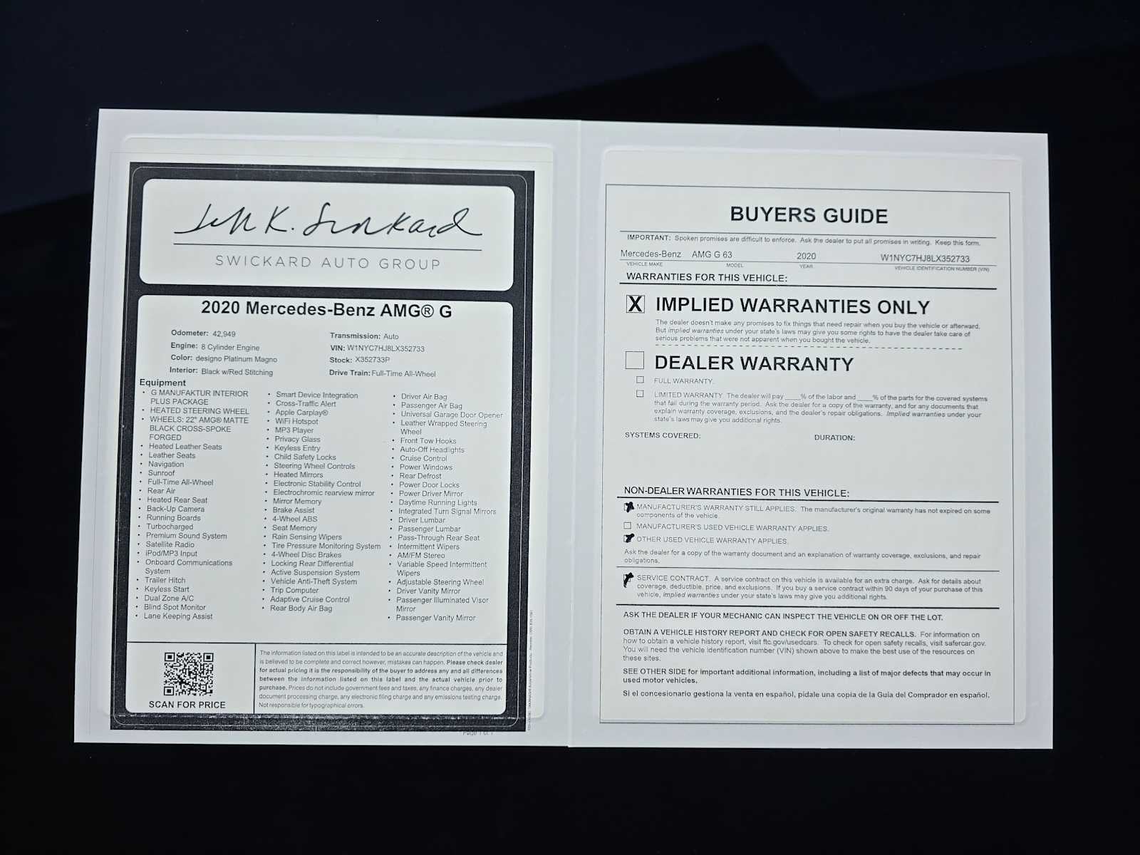 G MANUFAKTUR INTERIOR PLUS PACKAGE Seat Comfort Package, Drive-Dynamic Multicontour Front Seats w/Massage, Rapid Heating Functionality for Front Seats, Front Ventilated Seats, G manufaktur Interior Plus, Nappa leather seat upholstery, Nappa upper and lower parts of dashboard, Nappa leather upper door panels, knee pads, arm rests in the doors and center console, Nappa leather inside of tailgate and G manufaktur badge on front passenger grab handle, Diamond Stitching, Nappa Leather Dashboard, WHEELS: 22 AMG® MATTE BLACK CROSS-SPOKE FORGED Tires: 295/40R22, HEATED STEERING WHEEL, Leather Seats, Navigation, Sunroof, Full-Time All-Wheel, Rear Air