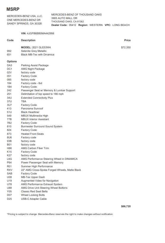 WHEELS: 22 AMG® CROSS-SPOKE FORGED MATTE BLACK Tires: 285/40R22 Fr & 325/35R22 Rr, POWER TILT/SLIDING PANORAMA SUNROOF, AMG® NIGHT PACKAGE trim on A-wing, rear apron, tailpipes, front splitter, window frames, heat-insulating dark-tinted glass and railing in high-gloss black, AMG® Exterior Night Styling, PARKING ASSISTANCE PACKAGE Parking Package w/Surround View Camera System, Surround View System, PASSENGER SEAT MEMORY, Navigation, Full-Time 4MATIC® All-Wheel, Power Liftgate, Heated Driver Seat, Premium Sound System Mercedes-Benz of Thousand Oaks is your local Mercedes-Benz dealership, serving the Thousand Oaks and Los Angeles Metro area since 1982. Our showroom always includes the most current luxurious and sophisticated Mercedes-Benz models. Were only a short trip from many communities, including Malibu and Simi Valley, and our team is happy to provide sales, financing, and automotive service and repair on site.