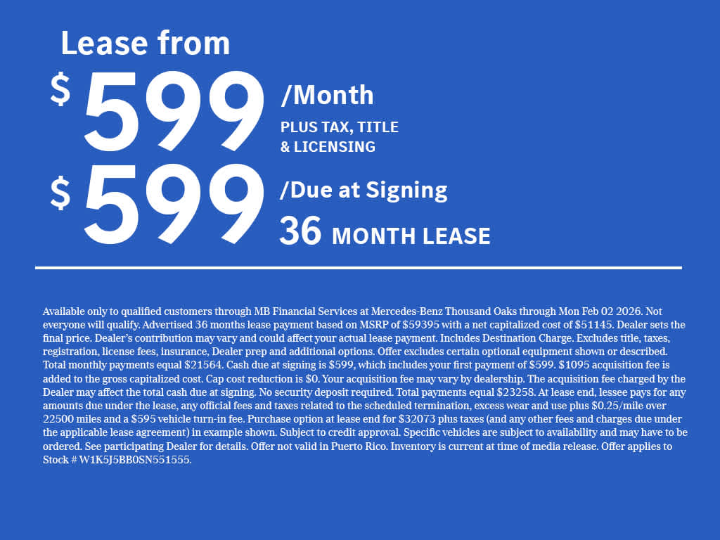 “A 1.75% surcharge is applied to all credit card transactions. This fee is not greater than our cost of acceptance. There is no fee for debit card payments.” *MSRP is the Manufacturer’s Suggested Retail Price, and is not the dealer’s advertised or asking price. See dealer for pricing details. MSRP excludes government fees and taxes, any finance charges, any dealer document processing charge, any electronic filing charge, any emission testing charge, insurance, and optional equipment, products, packages and accessories selected by the customer. All advertised vehicles are subject to actual dealer availability. Must qualify for all applicable incentives. Prices include all dealer incentives. Images displayed may not be representative of the actual trim level of a vehicle, and colors shown are the most accurate representations available. All vehicles are one of each, and all offers expire at close of business on the day the offer is removed from this website. All financing is subject to credit approval. While great effort is made to ensure the accuracy of the information on this website, errors do occur so please verify information with one of our dealership representatives. **The charging voucher is subject to the program terms of Mercedes-Benz USA’s service provider ChargePoint, which are presented to the customer when the Mercedes me Charge service is activated. All MY25 BEV customers, excluding eSprinter, also receive 2 years of free unlimited charging at Mercedes-Benz High Power Charging (“MB HPC”) network; those charging sessions are always free during such 2-year period and are therefore not covered by the $1,000 charging voucher if selected. However, idle fees incurred at MB HPC stations are the responsibility of the customer and will be charged to the customer’s Mercedes me Charge account, which could be covered by either a valid payment method associated with the account or the balance of the charging voucher. The offer is non-refundable, non-transferrable, and non-cancelable once a selection has been made and has no cash value. Additionally, the offer is subject to change and may be discontinued at any time. Bluetooth® is a registered mark of Bluetooth® SIG, Inc. Android Auto® is a trademark of Google LLC. Apple CarPlay® is a registered trademark of Apple Inc.