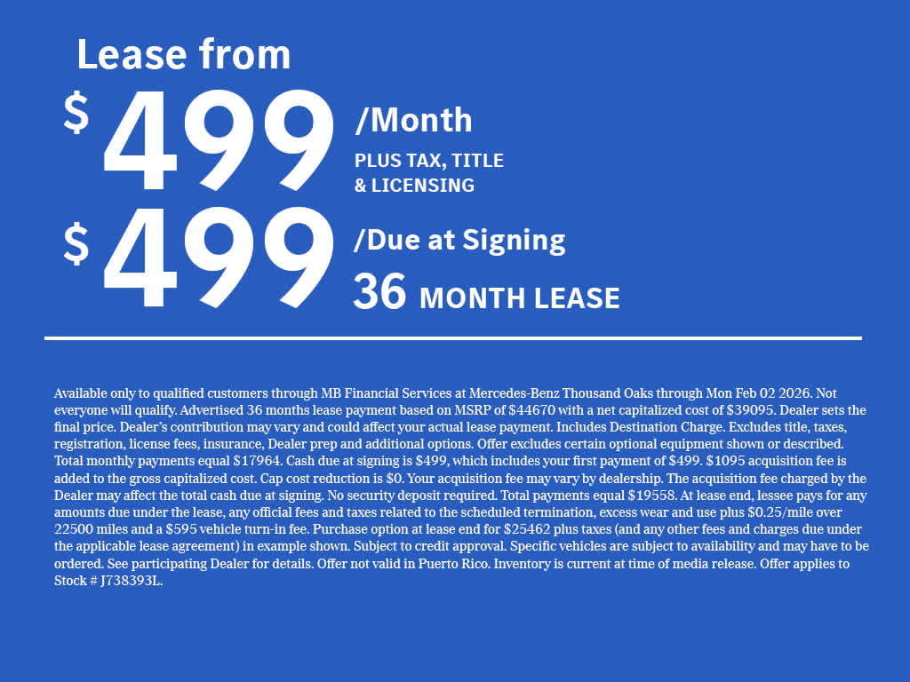 “A 1.75% surcharge is applied to all credit card transactions. This fee is not greater than our cost of acceptance. There is no fee for debit card payments.” *MSRP is the Manufacturer’s Suggested Retail Price, and is not the dealer’s advertised or asking price. See dealer for pricing details. MSRP excludes government fees and taxes, any finance charges, any dealer document processing charge, any electronic filing charge, any emission testing charge, insurance, and optional equipment, products, packages and accessories selected by the customer. All advertised vehicles are subject to actual dealer availability. Must qualify for all applicable incentives. Prices include all dealer incentives. Images displayed may not be representative of the actual trim level of a vehicle, and colors shown are the most accurate representations available. All vehicles are one of each, and all offers expire at close of business on the day the offer is removed from this website. All financing is subject to credit approval. While great effort is made to ensure the accuracy of the information on this website, errors do occur so please verify information with one of our dealership representatives. **The charging voucher is subject to the program terms of Mercedes-Benz USA’s service provider ChargePoint, which are presented to the customer when the Mercedes me Charge service is activated. All MY25 BEV customers, excluding eSprinter, also receive 2 years of free unlimited charging at Mercedes-Benz High Power Charging (“MB HPC”) network; those charging sessions are always free during such 2-year period and are therefore not covered by the $1,000 charging voucher if selected. However, idle fees incurred at MB HPC stations are the responsibility of the customer and will be charged to the customer’s Mercedes me Charge account, which could be covered by either a valid payment method associated with the account or the balance of the charging voucher. The offer is non-refundable, non-transferrable, and non-cancelable once a selection has been made and has no cash value. Additionally, the offer is subject to change and may be discontinued at any time. Bluetooth® is a registered mark of Bluetooth® SIG, Inc. Android Auto® is a trademark of Google LLC. Apple CarPlay® is a registered trademark of Apple Inc.